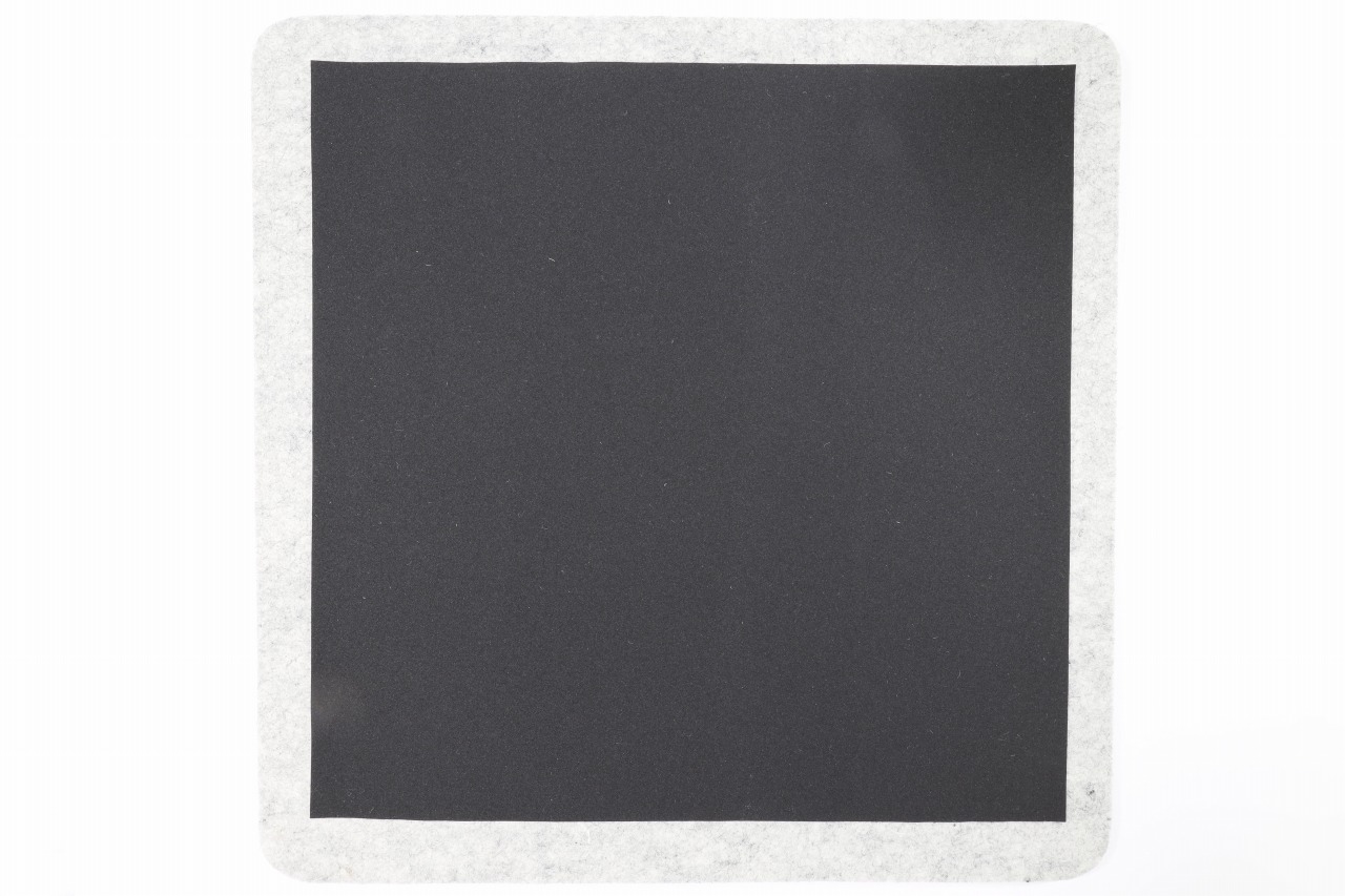 製品版は滑り止めシートが接着されたものでしたが、本販売商品には滑り止めシートは装着されていません。軽量のタイプライターで滑りやすいデスクの場合はフェルト素材の性質上、滑りやすい場合があります。その場合はゴムシートなどの滑り止めをマットの下に敷くことで改善されます。画像のゴムシートは当店でも販売可能です。