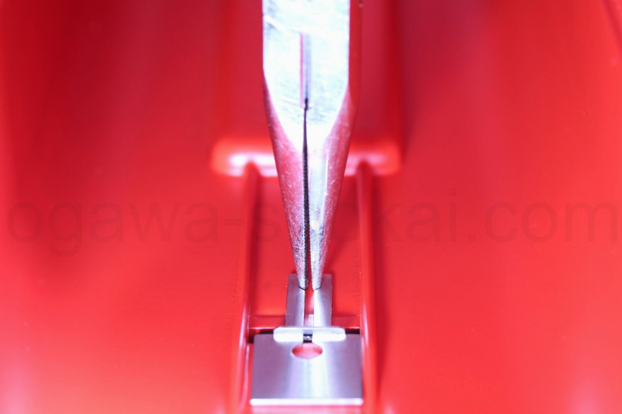 キーの輪っか(下側の○)にペンチの先端などを差し込みキーを広げます。