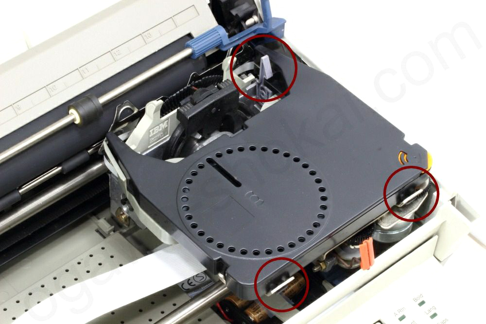 ここではIBM 電子式タイプライター Wheelwriterを例にインクリボンおよび修正テープの交換方法をご説明いたします。各メーカー間で若干の違いはありますのであくまで参考程度にしてください。