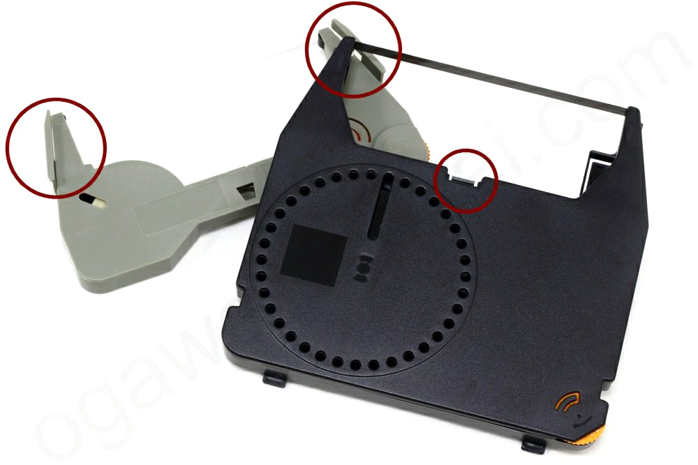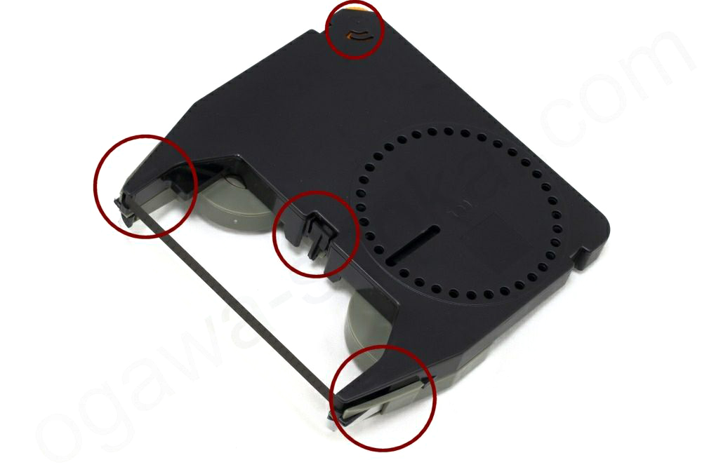 olivettiタイプとbrotherタイプは、リボンの端にあるハトメをリボンリバーシングガイドより外側になるようにセットしてください。最後に【⼿順3】の逆の⼿順でリボンをリボンガイドに取り付けて終了です。