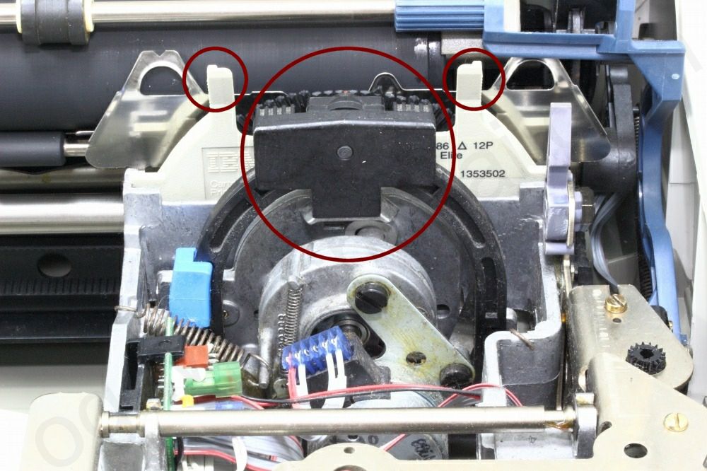リボンガイドから古いリボンを取り外します。 機種によってはシフトロックをセットしてリボンポジションセレクターを⾚にして更にタイプバーを上に固定するとリボンホルダーが上に上がり作業しやすくなります。リボンを取り外す際はピンセットを使用されると細かい作業でもやりやすく、手を汚さず作業できます。