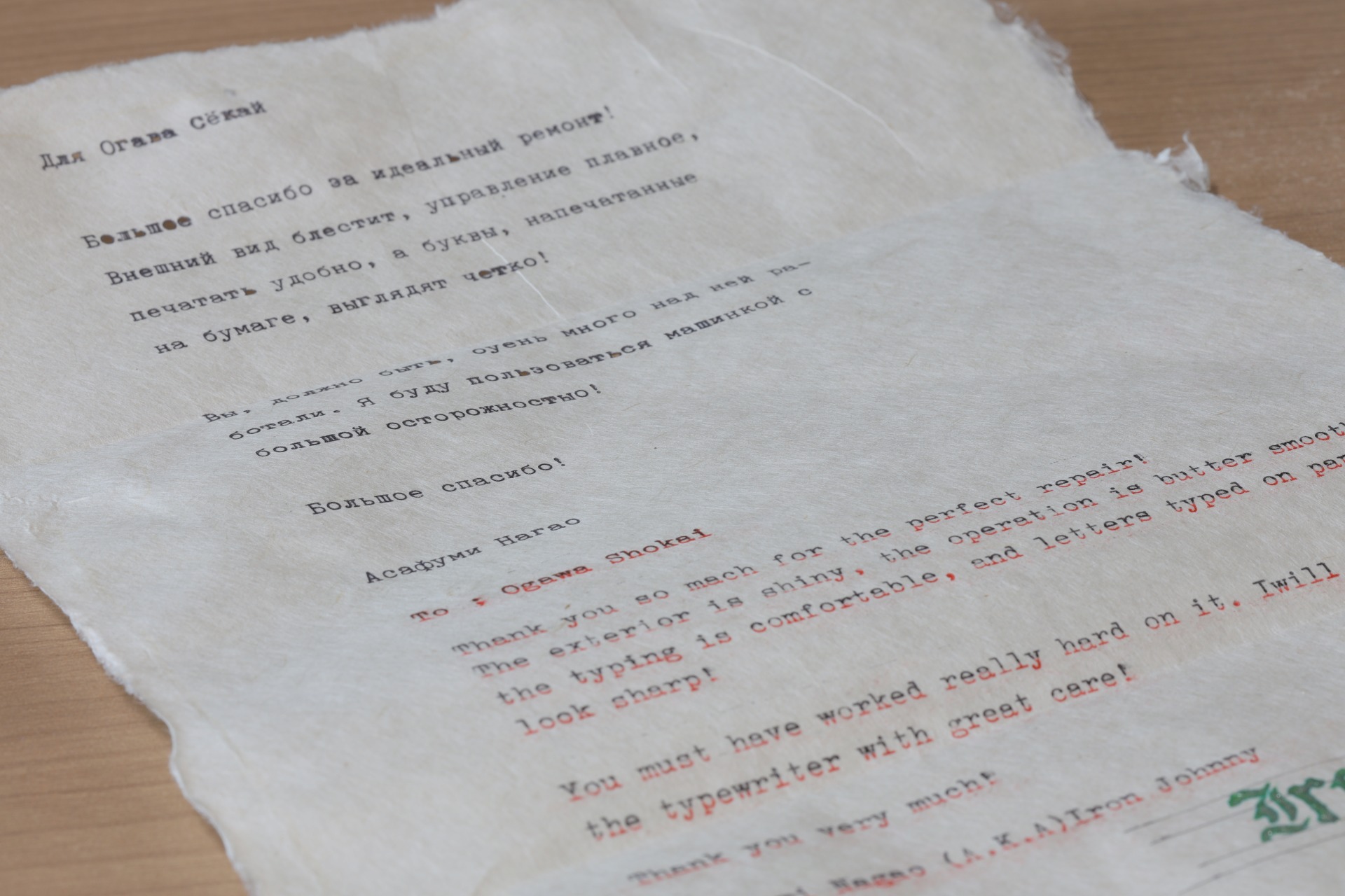 パソコンのプリンターでは難しいシワのある用紙や特殊な紙にもタイプライタなら印字することが出来る場合があります。用紙によってはタイプライターでも難しいものがありますので、素敵な用紙は楽しみながら探してださい。画像はHERMES 2000の修理をご依頼いただいたiron.johnny.1969さまによる出雲民芸紙という特別な用紙を使ったお礼状と、Nooi's Worldさまによる水彩画へタイプライターを使用した例です。