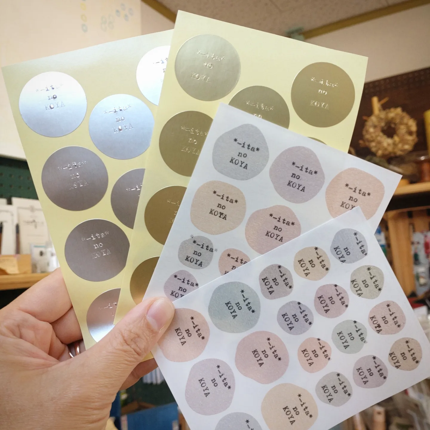 タイプライターなら位置決めが自由なので、シート状のシールへの印字も得意分野です。金銀のラベルシールはステンシル(インクがでない)で表現されていて素敵なアイディアだなと感心させられました。