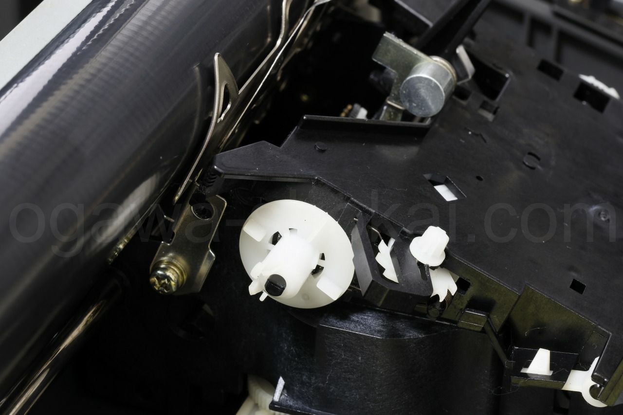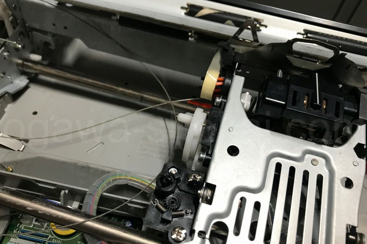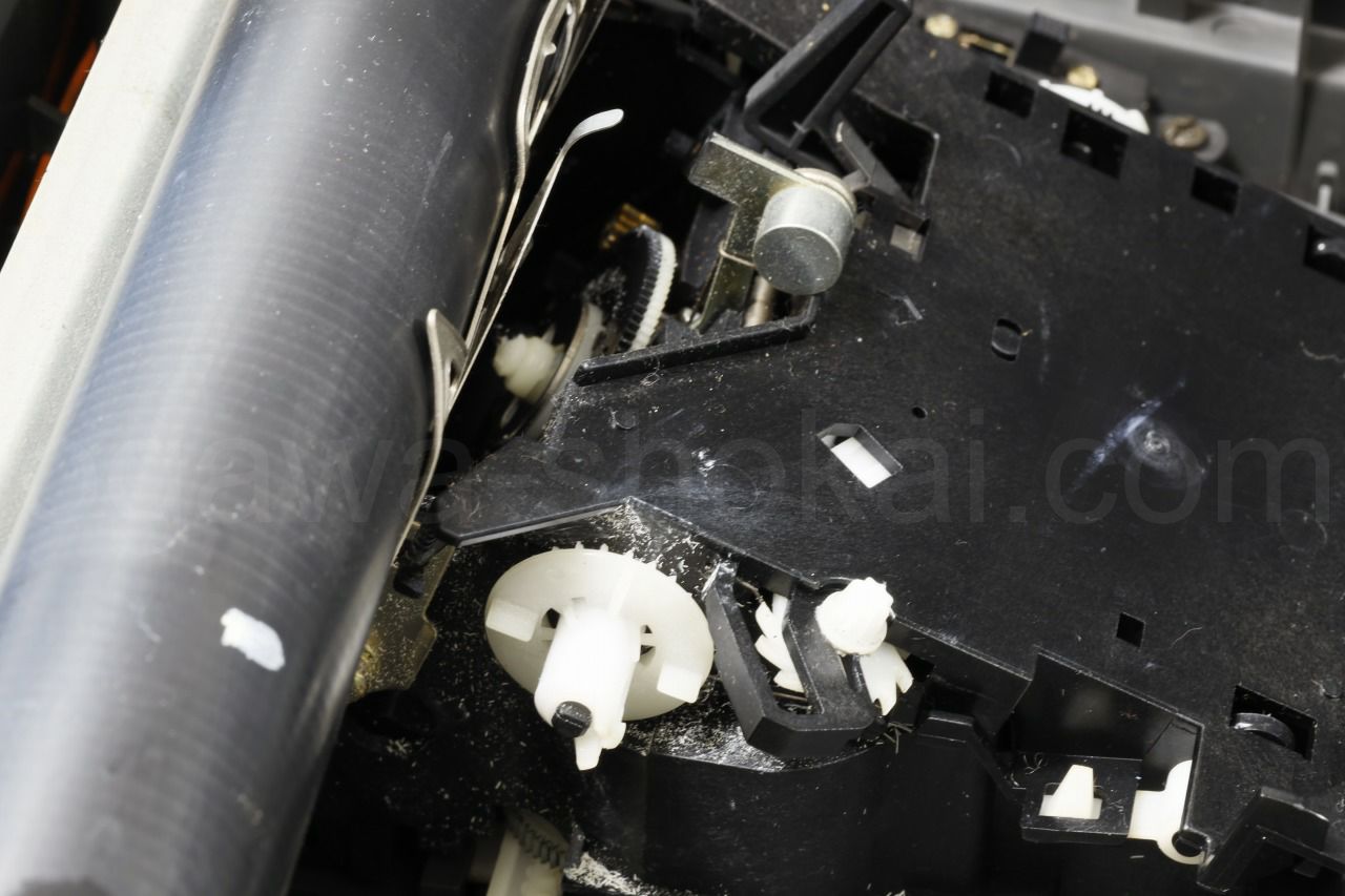用紙を抑えて右に稼働する部分(キャリッジ?シリンダー?)がごっそり宙に浮いてしまっており、真ん中に歯車がついた黒いフレームが2本ベアリング?な銀色の玉が4つがケースの底に脱落している。