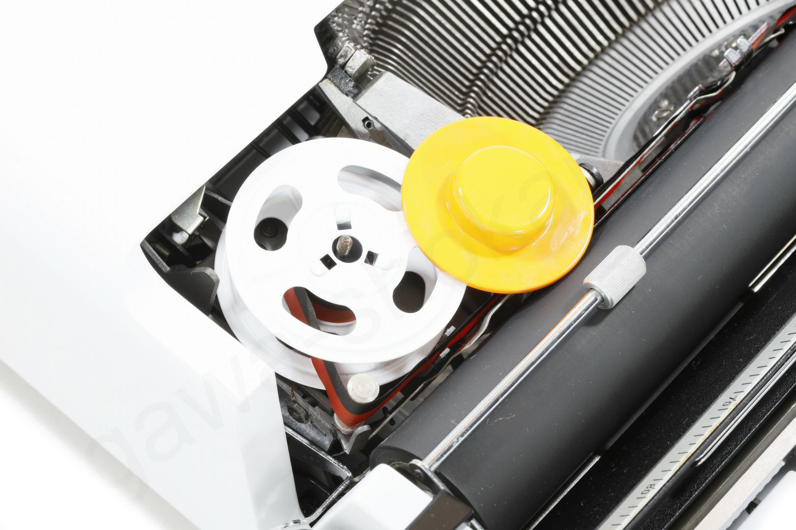 - 白にリカラーしたリボンスプールは色の性質上インクリボンのインクが目立ちます(濡らした綿棒で簡単に取ることができます)。