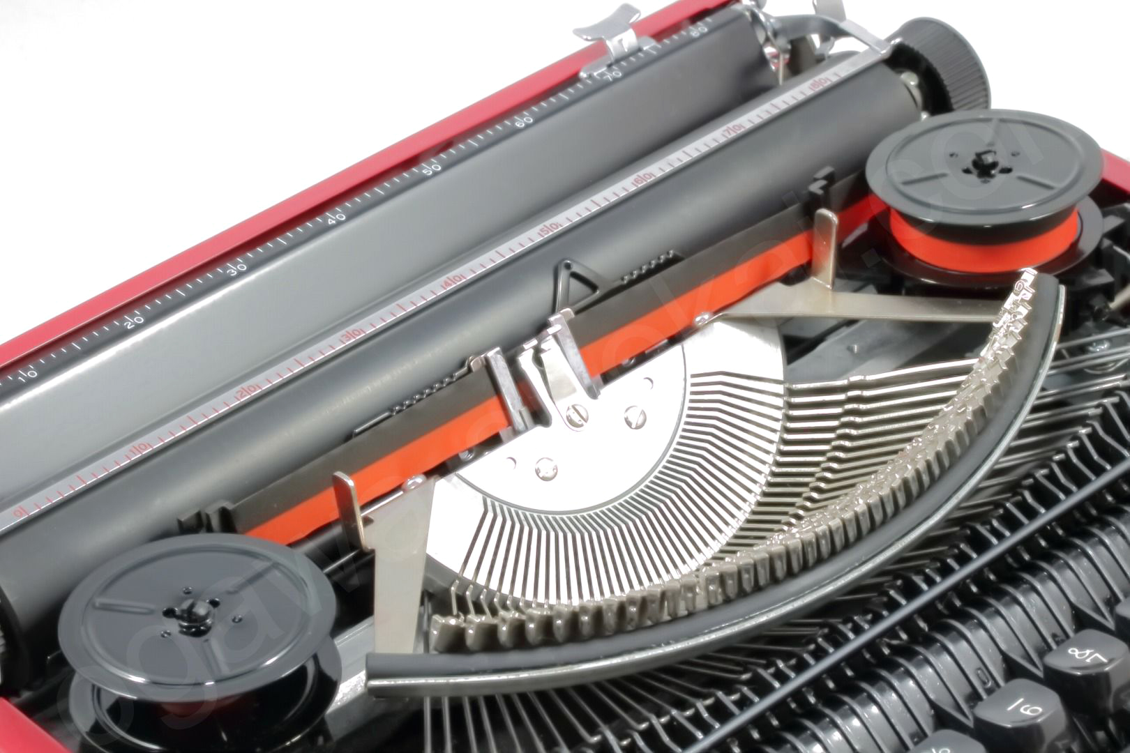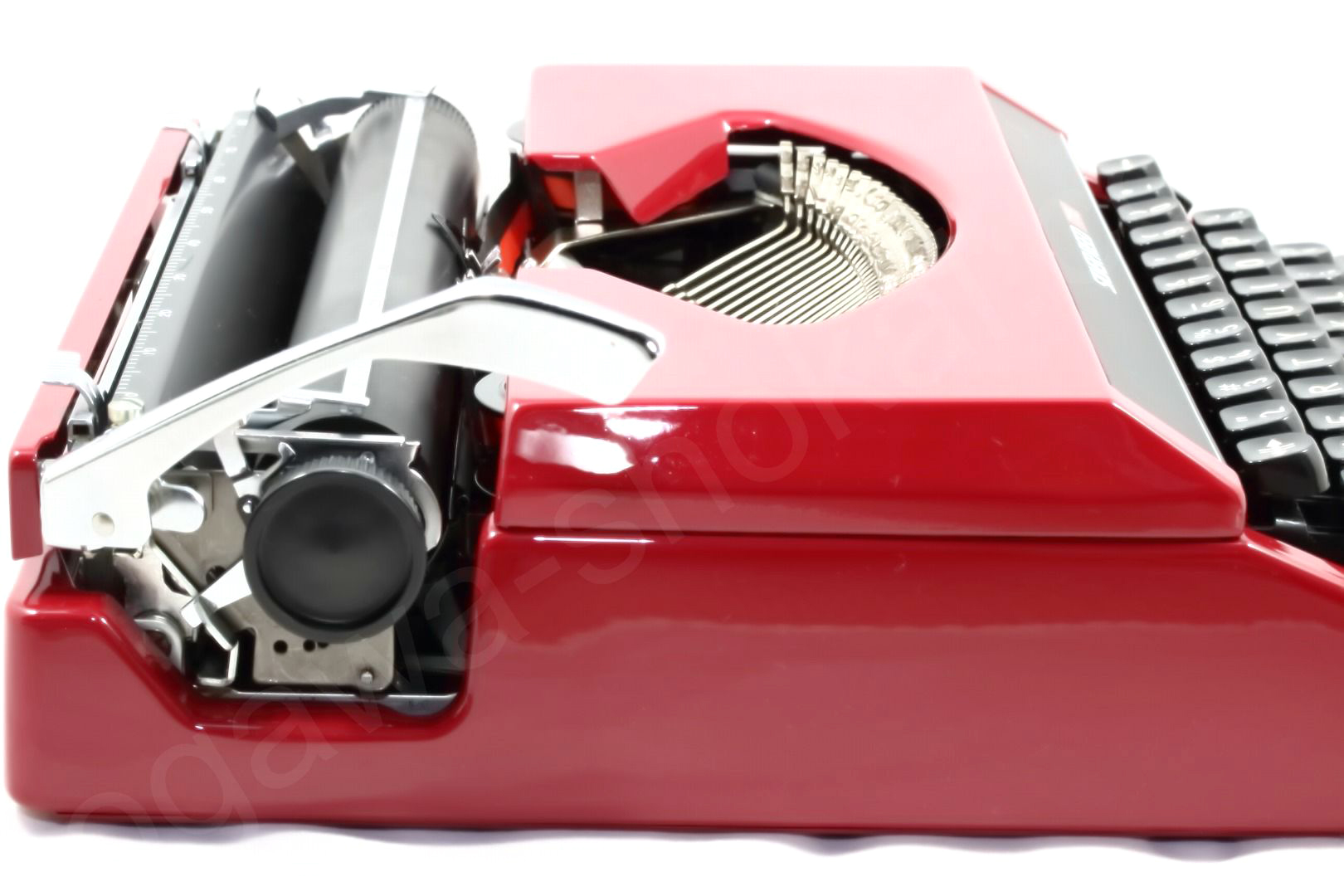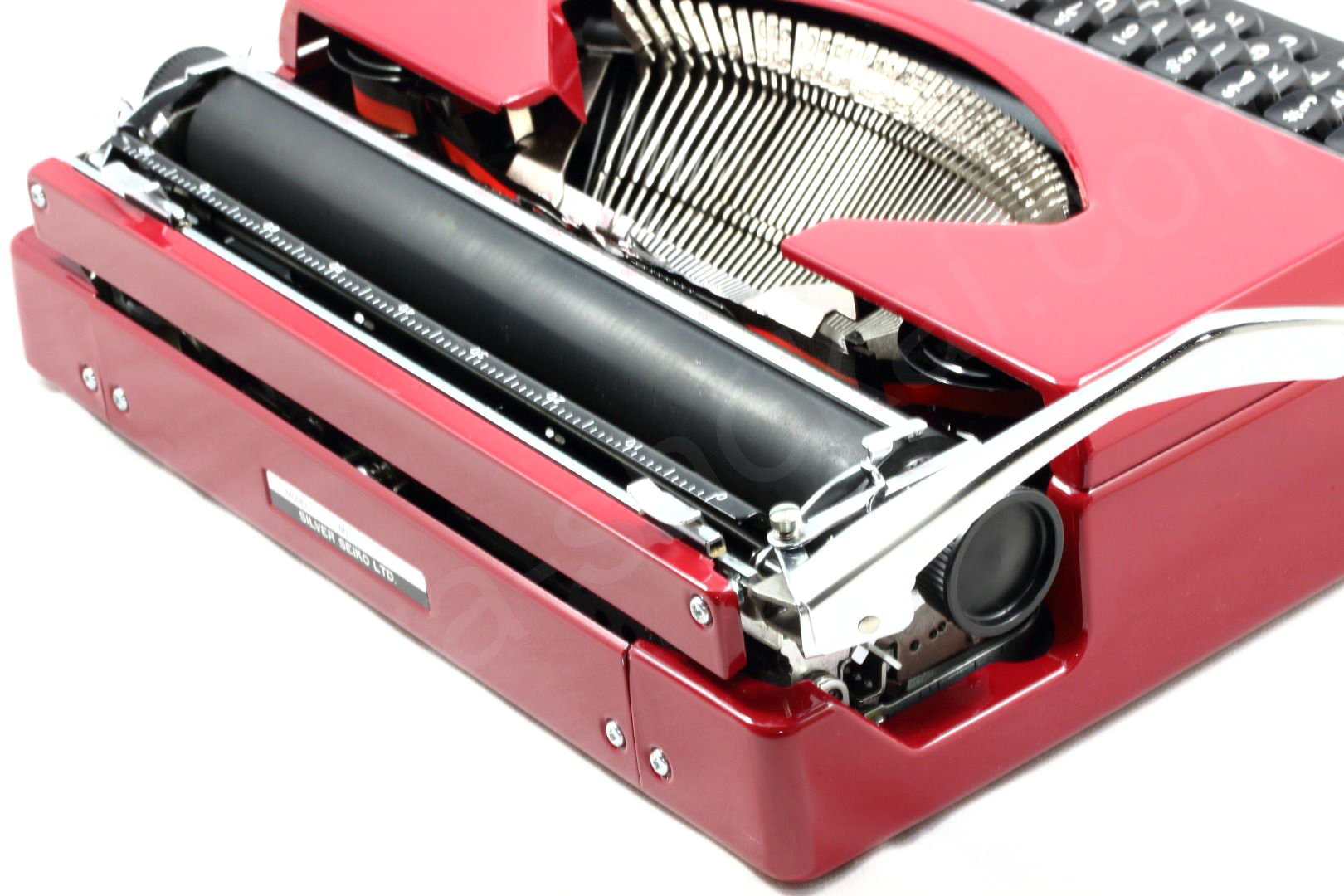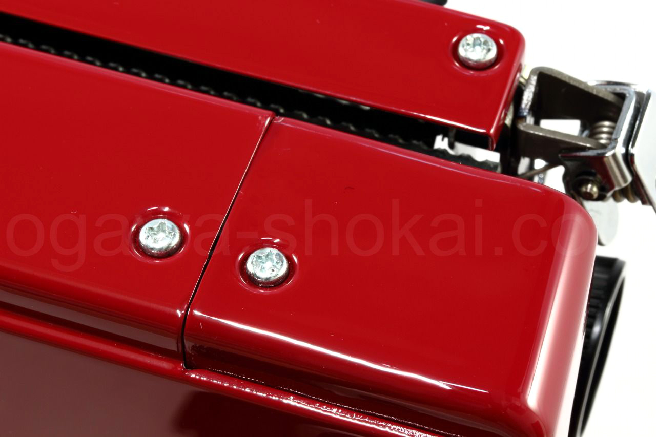 日本のタイプライター製造メーカーのひとつSILVER-REEDのタイプライターは日本製ならではの安心感をもってご使用いただけるかと思います。国内製でとってもコンパクト。人気のあるolivetti valentineよりひとまわり程度小さいサイズです。小さいながらも日本製ならではの作りからしっかりしているのでタイプライタービギナーにお勧めできる手動式タイプライターです。ソフトなキータッチも魅力です。お色はオリジナルの高級感も漂う深みのある赤をそのままを再塗装で再現。クリアも塗装していますのでオリジナルより傷が付きにくくなっております。ケースはオリジナルの半ツヤから高級感を出してマットブラック(ピーチスキン風)にアレンジしてございます。よくあるプラテンノブの傷はオリジナルが綺麗な状態でしたのでオリジナルのままとしています。貴重なオリジナル金属製スプールも残っているので当時の雰囲気も損なっていません。