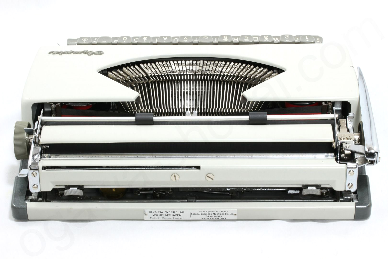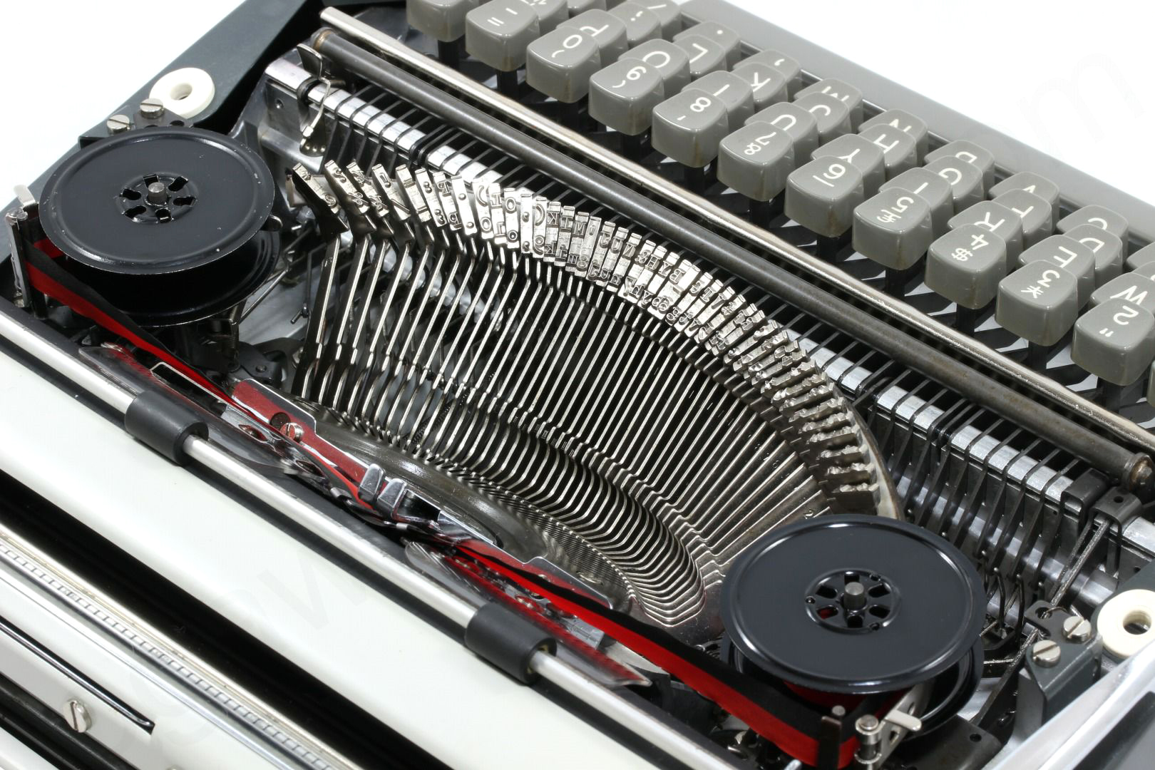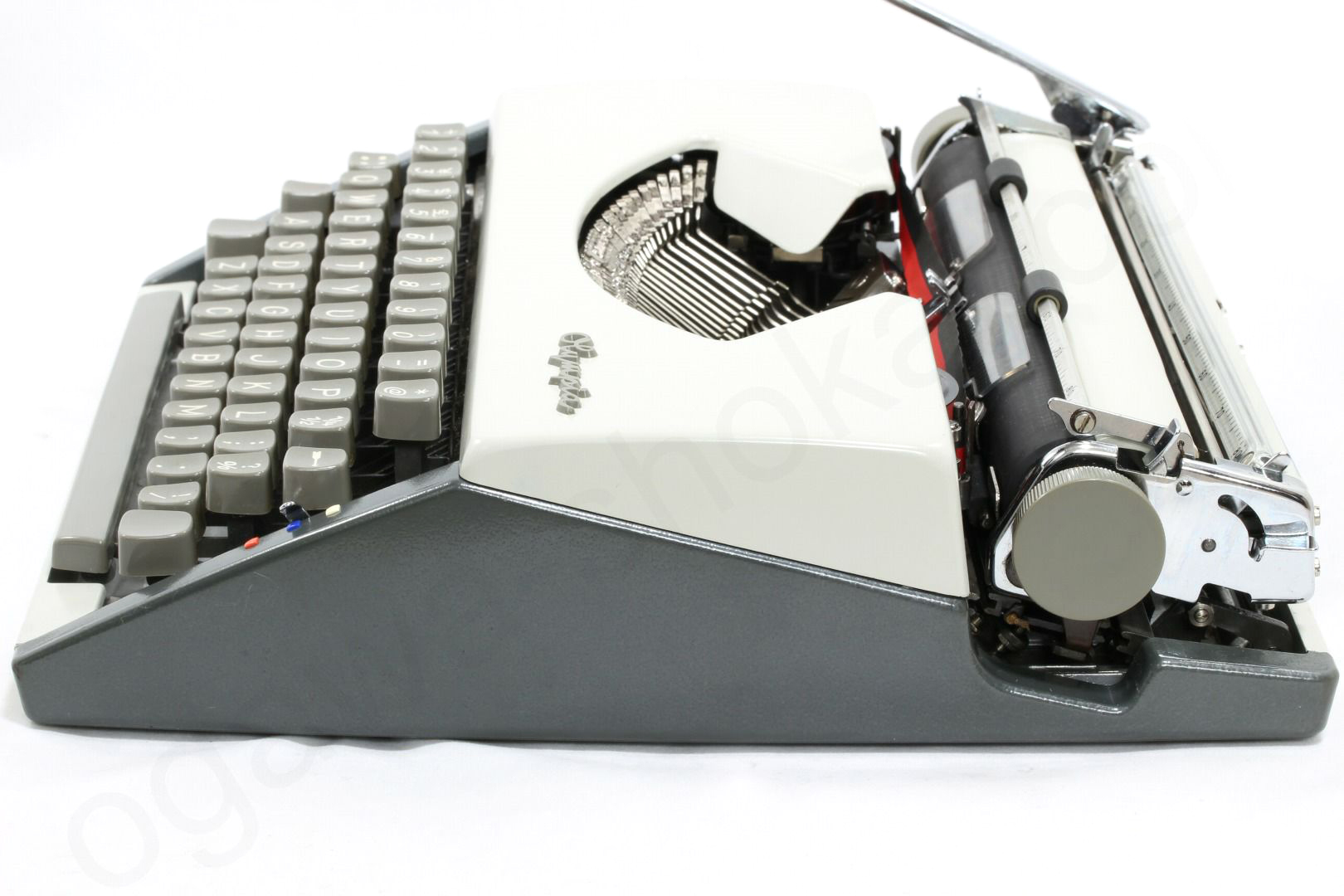 olivettiに並ぶドイツの人気ブランドOLYMPIAはタイプライターがお好きな方や詳しい方には特に人気のあるブランドです。こちらのde luxe model99はポータブルタイプライターの中でもコンパクトなサイズですがドイツ製ならではのしっかりした作りなのでビジネスにも十分にお使いいただけます。スタンダード品質の中古タイプライターなのでボディーに傷や痛みはありますがタイプライターの内部は専門店品質でオーバーホール(分解洗浄)しており、各部注油/調整/点検済なので届いたらすぐに。そして何より重要な、手に入れたその時限りではなく長期に渡ってご使用いただけます。タイプライター専門店でしっかり整備された程度の良好なタイプライターをお試しください。通常革のケースは痛みが多いですがこちらのケースは比較的痛みも少ないのでケースを含めても実用的かと思います。なおオリジナルはリボン機構に少し問題があるためどんな使用でも確実に動作するようにギミックを追加しています。貴重なオリジナルのメタルスプールもそのままなので当時の雰囲気も損なっていません。