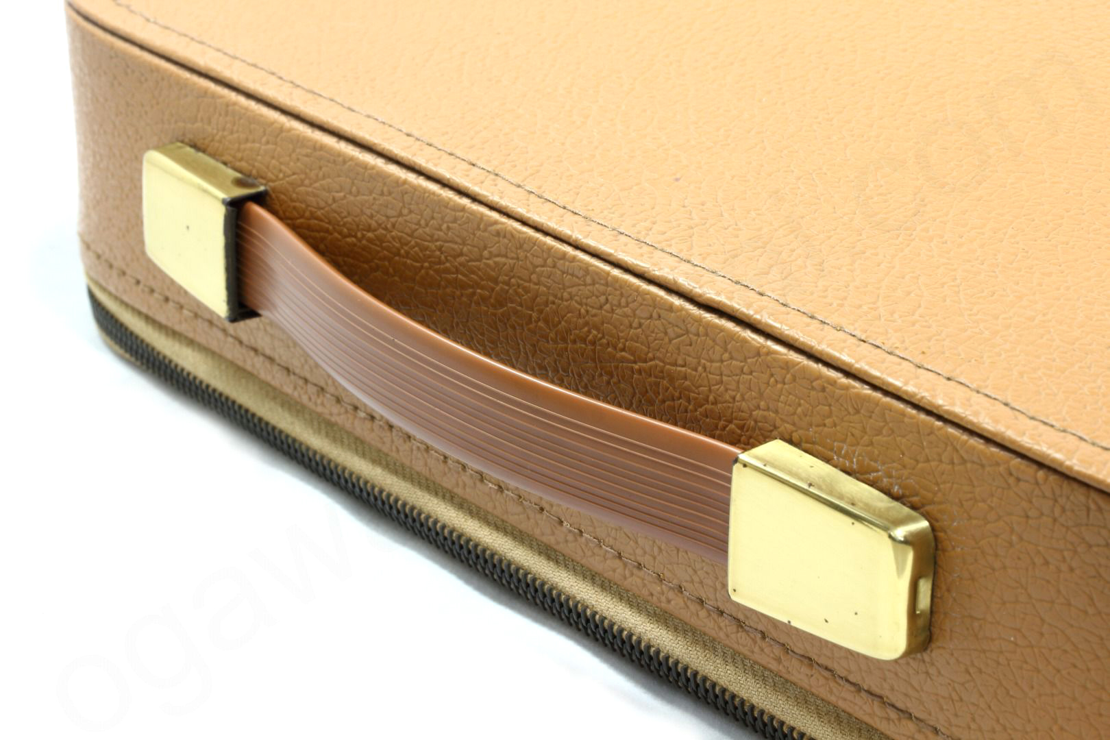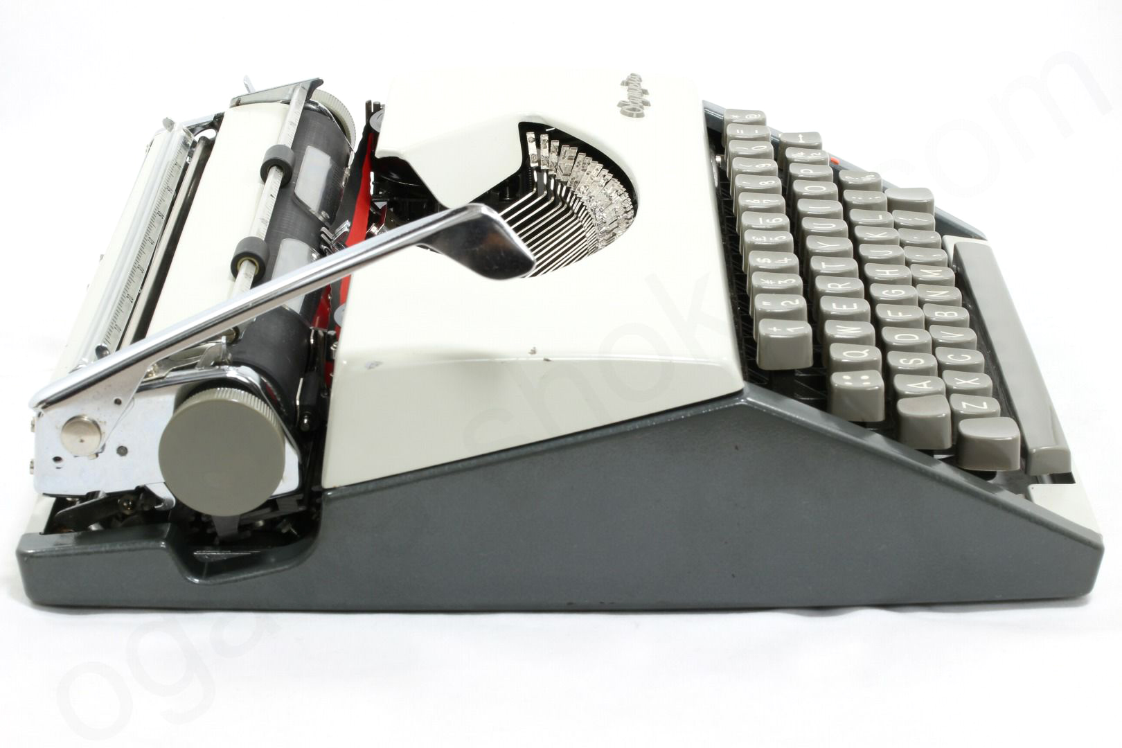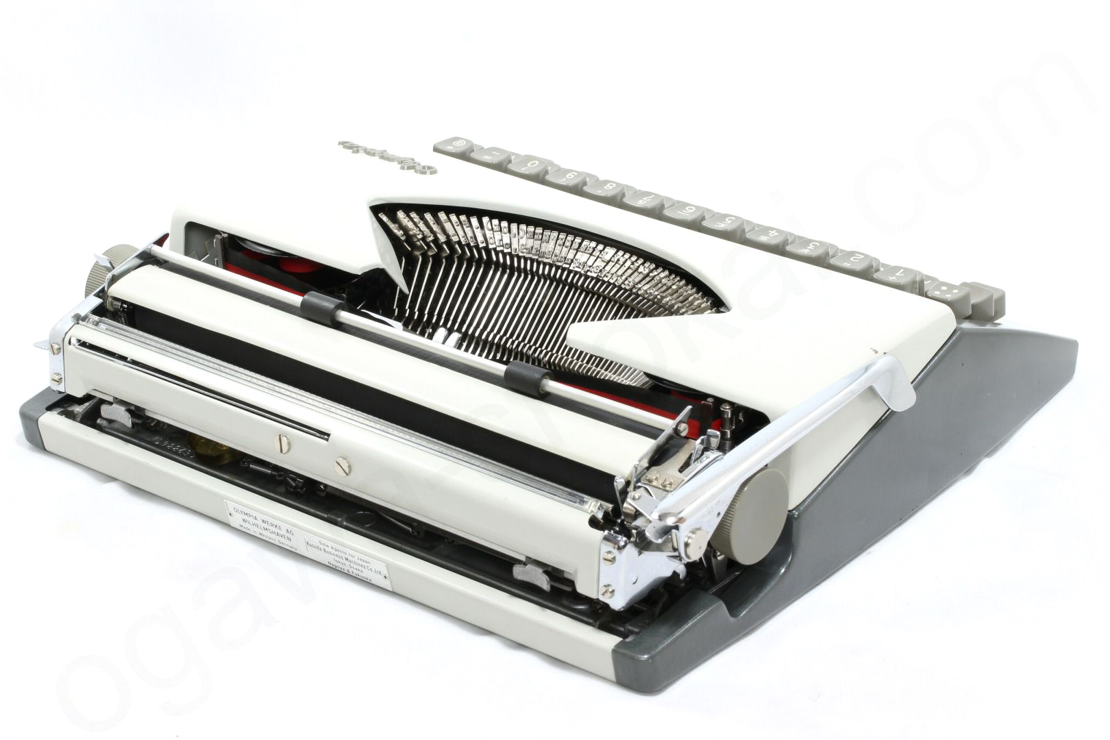 olivettiに並ぶドイツの人気ブランドOLYMPIAはタイプライターがお好きな方や詳しい方には特に人気のあるブランドです。こちらのde luxe model99はポータブルタイプライターの中でもコンパクトなサイズですがドイツ製ならではのしっかりした作りなのでビジネスにも十分にお使いいただけます。スタンダード品質の中古タイプライターなのでボディーに傷や痛みはありますがタイプライターの内部は専門店品質でオーバーホール(分解洗浄)しており、各部注油/調整/点検済なので届いたらすぐに。そして何より重要な、手に入れたその時限りではなく長期に渡ってご使用いただけます。タイプライター専門店でしっかり整備された程度の良好なタイプライターをお試しください。通常革のケースは痛みが多いですがこちらのケースは比較的痛みも少ないのでケースを含めても実用的かと思います。なおオリジナルはリボン機構に少し問題があるためどんな使用でも確実に動作するようにギミックを追加しています。貴重なオリジナルのメタルスプールもそのままなので当時の雰囲気も損なっていません。