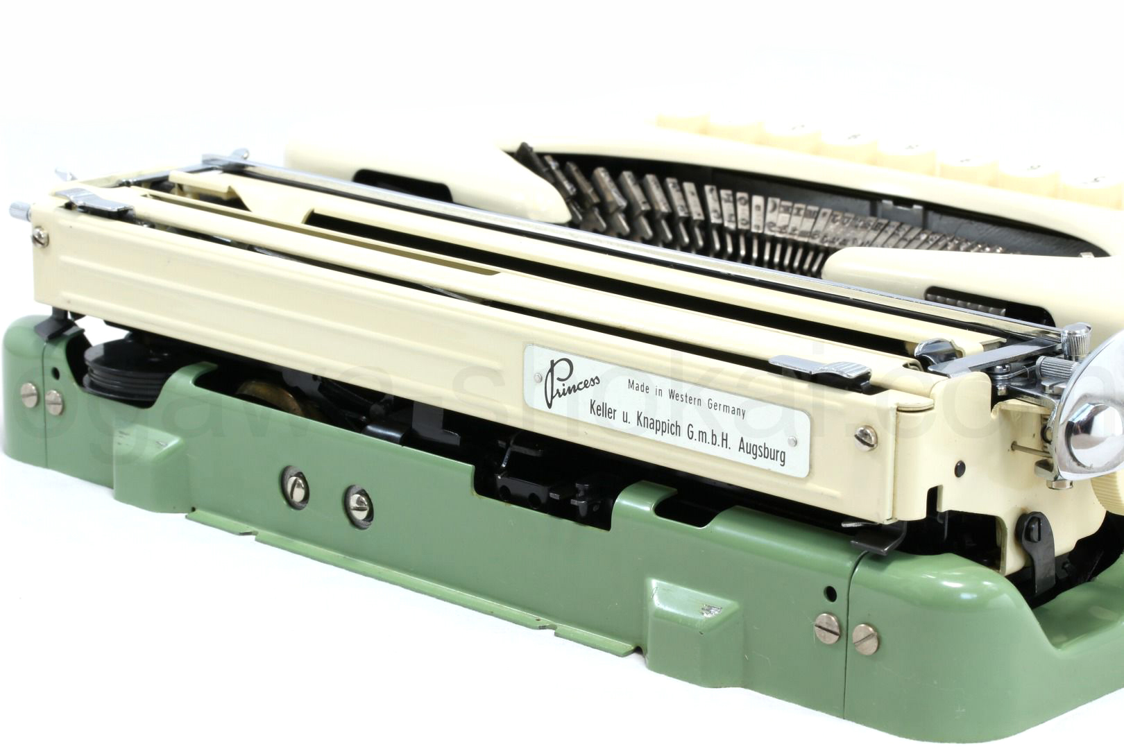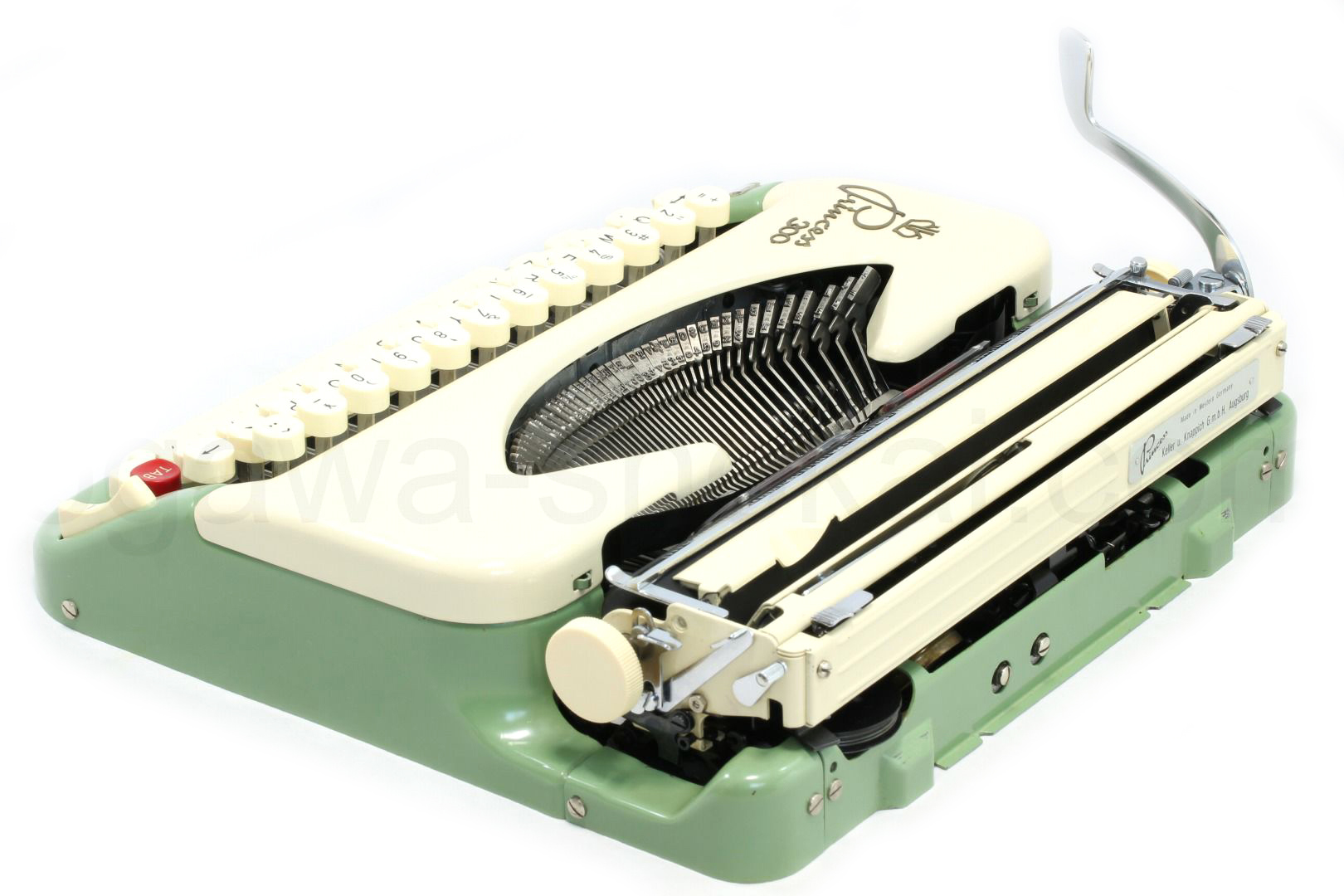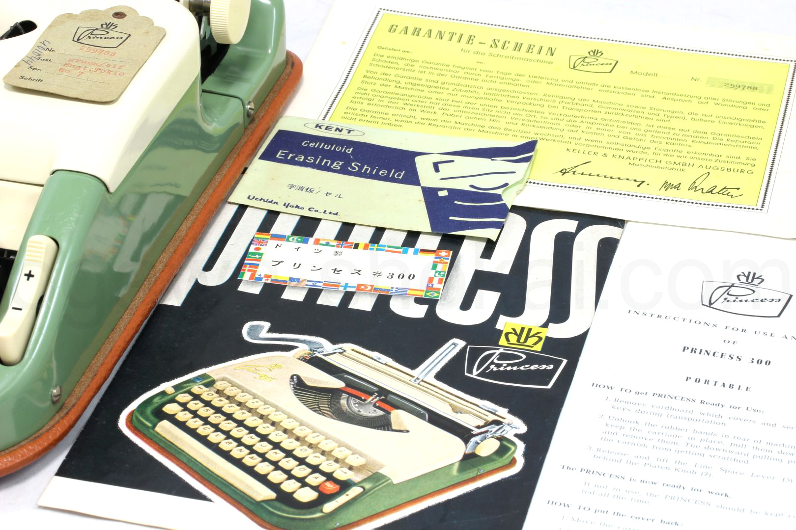 Princess 300はPrincessのタイプライターでは最上位機種のモデルです。国内外でレアなドイツ製のタイプライターはかわいらしさとクラシックさを備えたタイプライターで、キーボードのタッチを好みで変えられるタッチコントロール/タブ機能/世界で最初の押しボタン式のリボン切り替え機能など小さいながらも基本性能はきちんと装備されています。オリジナルのカタログ/説明書などもきちんと保存されていてどれだけ長い間大切に保管されていたのが分かります。スタンダード品質の中古タイプライターなのでボディーに傷や痛みはありますがタイプライターの内部は専門店品質でオーバーホール(分解洗浄)しており、各部注油/調整/点検済なので届いたらすぐに。そして何より重要な、手に入れたその時限りではなく長期に渡ってご使用いただけます。タイプライター専門店でしっかり整備された程度の良好なタイプライターをお試しください。当店としてはこちらの機種は2台目の販売というレアでかわいらしいタイプライターをぜひご検討くださいませ。
